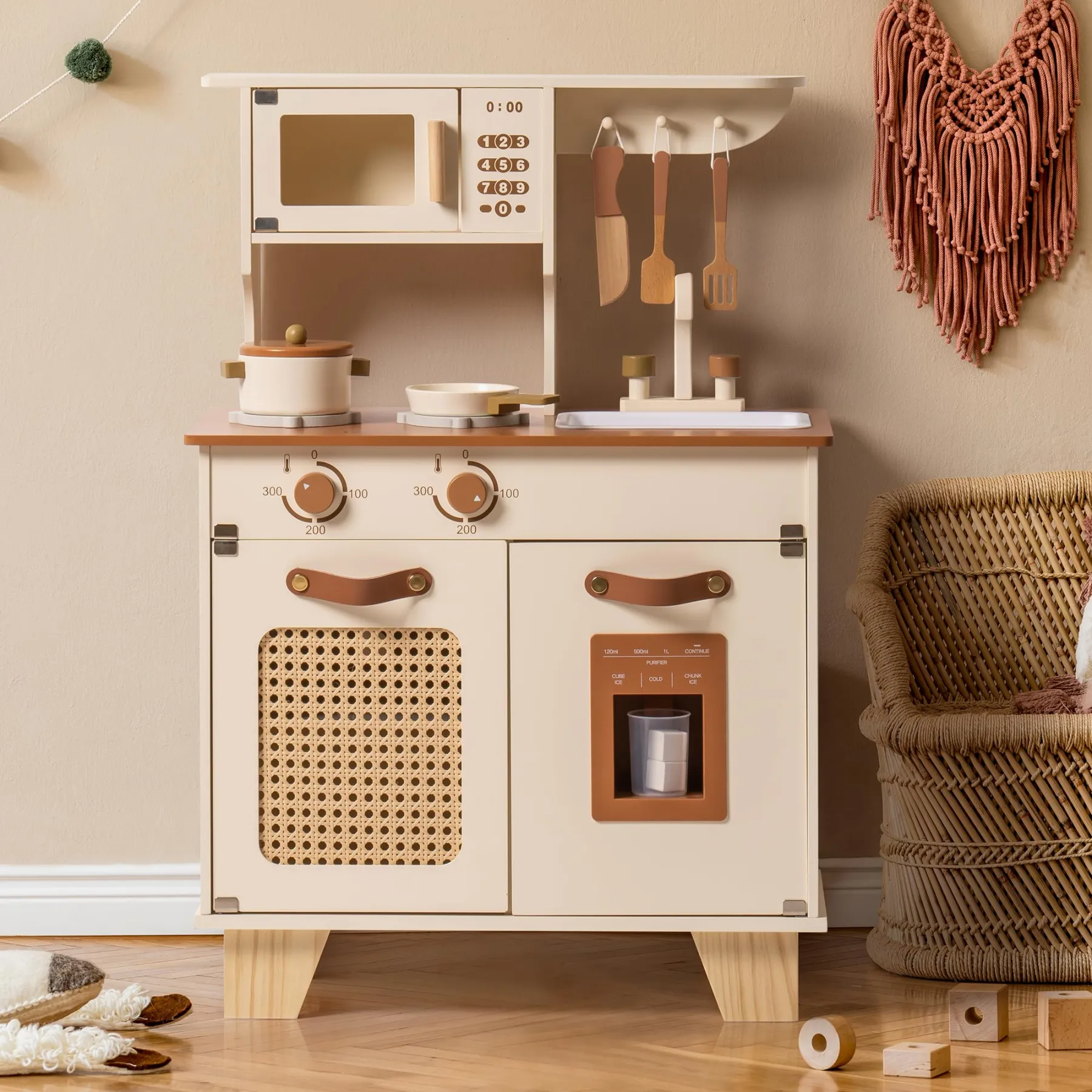 Mit Elementen wie Herd, Spüle, Backofen und Eiswürfelspender bietet die Küche vielseitige Spielmöglichkeiten. Drehbare Knöpfe und bewegliche Türen ermöglichen es Kindern, alltägliche Abläufe wie Kochen oder Reinigen nachzustellen und eigene Spielszenarien zu entwickeln.